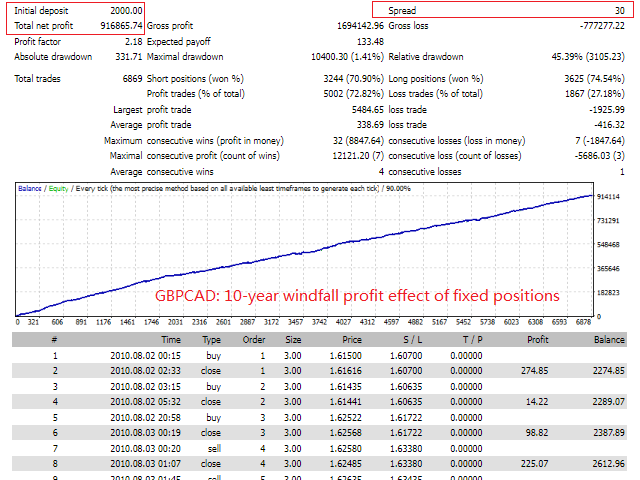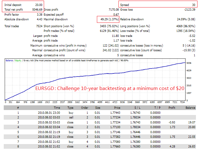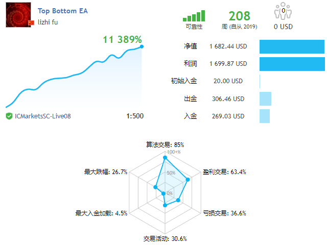 TopBottomEA’s advantage: the first support for small capital work EA, real trading for more than 4 years; this EA based on volatility adaptive mechanism, only one single at a time, each single with a stop-loss, an average of about 4 orders per day, holding a single length of 12 hours or so, with a limit of $ 20 principal challenge backtesting ran through more than 10 years.